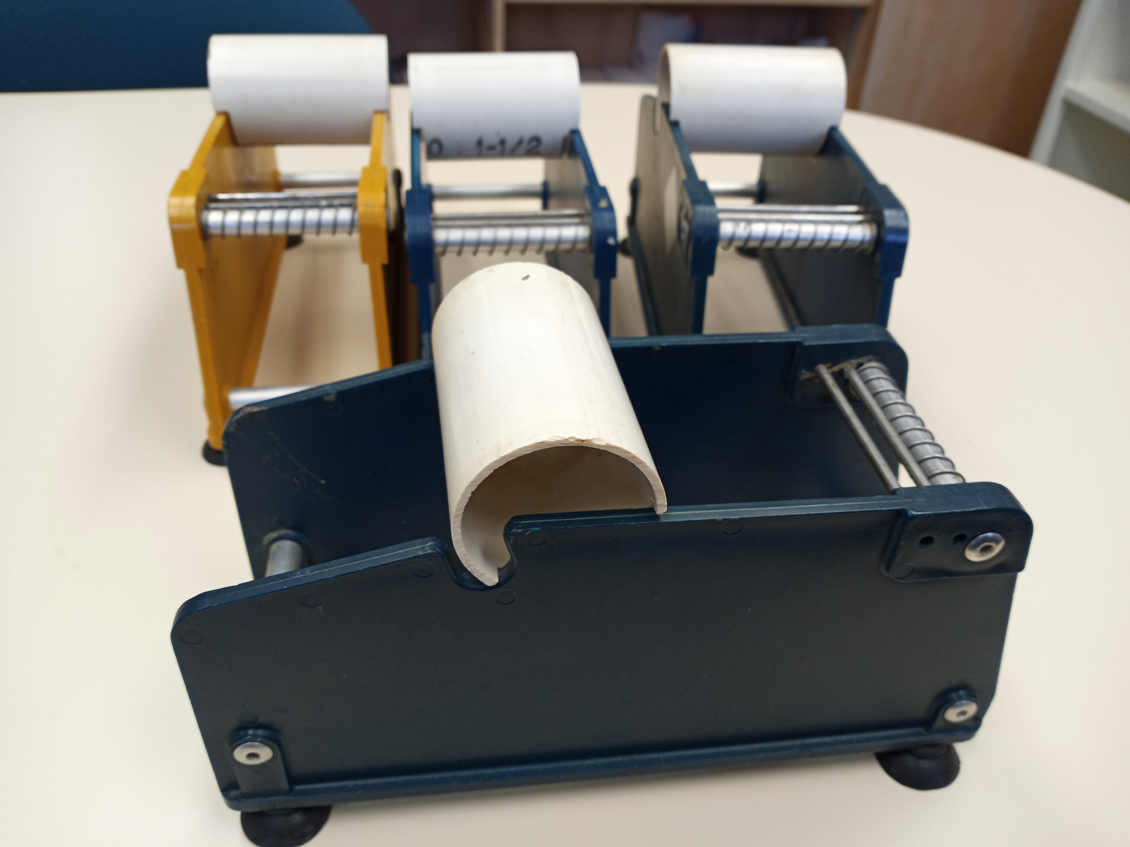 These dispensers make it easy to take barcodes or other stickers off a roll.  They can handle rolls up to 2.5 inches (6.5 cm) wide.  We have three blue dispensers and one tan.