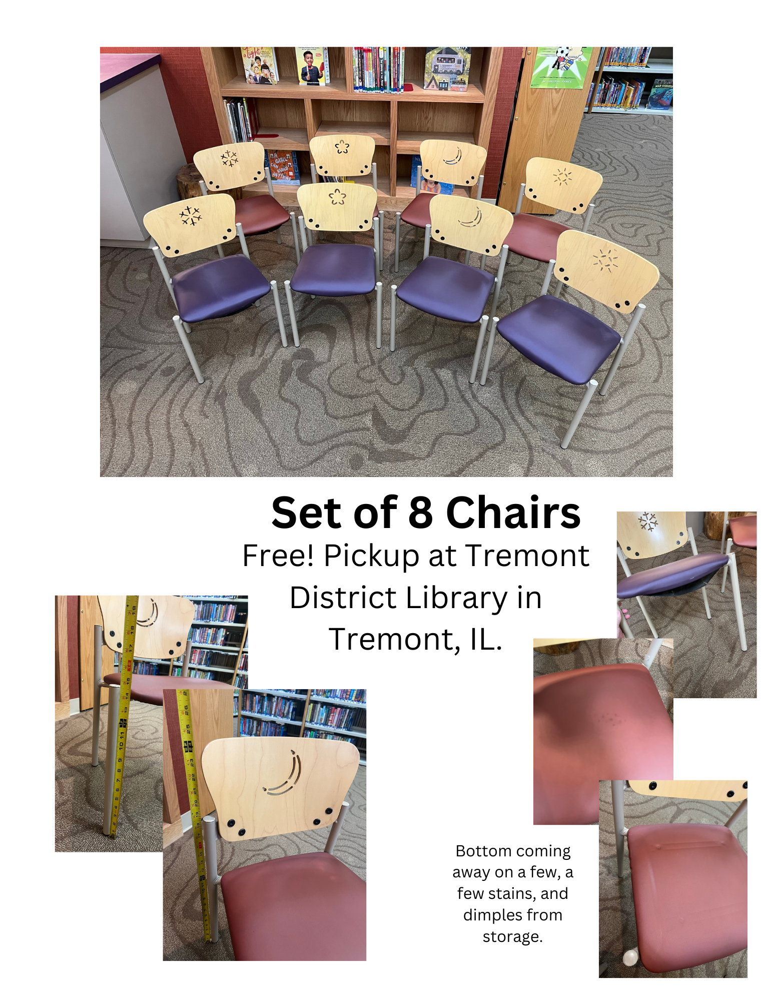 Set of 8 Children's Chairs. Seat backs reach about 2', the seats are about 14" off the ground. 4 are red, 4 are purple, there are varying designs on the backs. Some of the fabric on the bottoms of the chairs are loose, but they are otherwise in perfect condition! Dimples in seats from sitting in storage have gone away since pictures were taken.