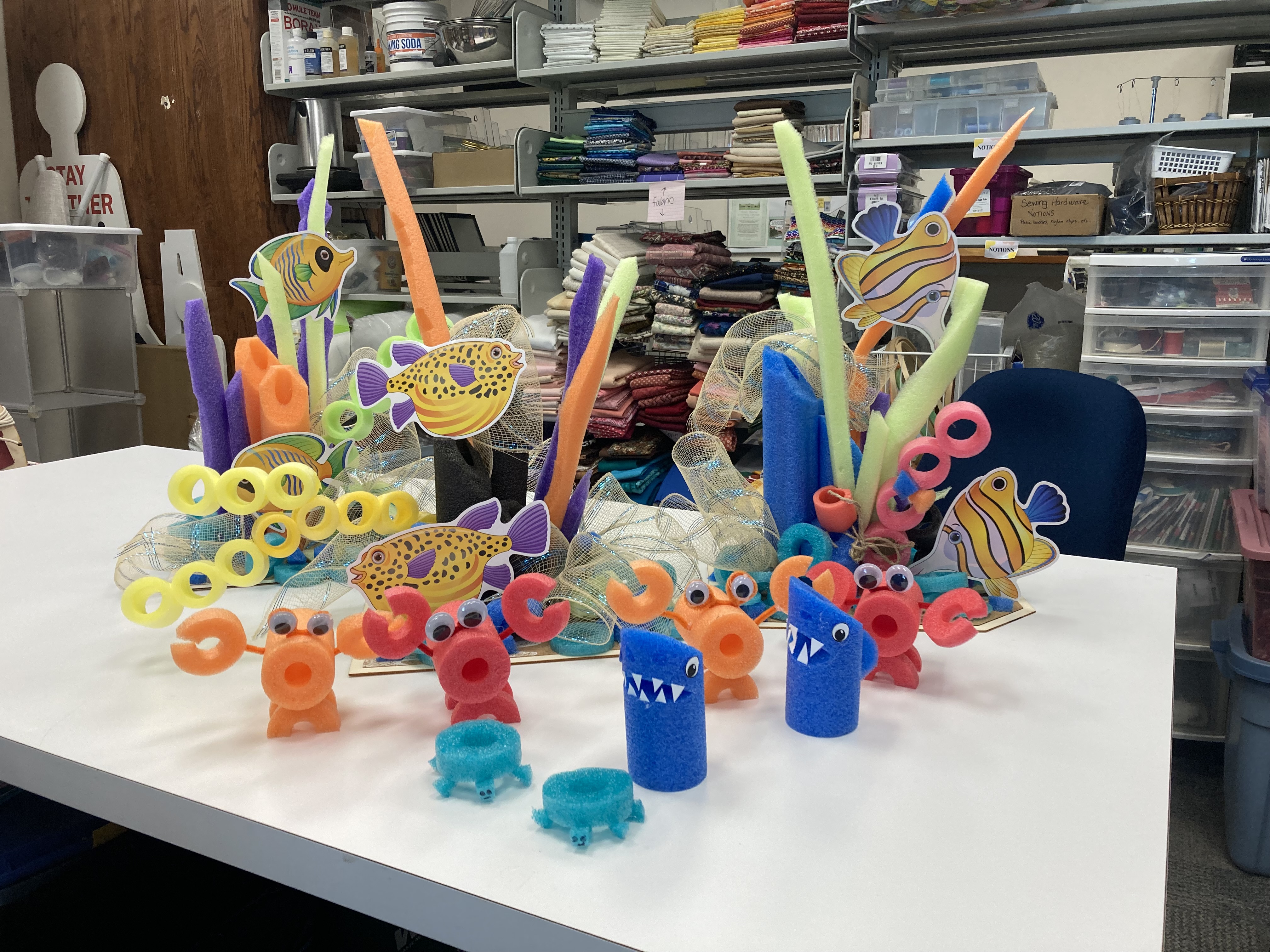 3 Large coral fish displays and many tiny creatures, all made of pool noodles.