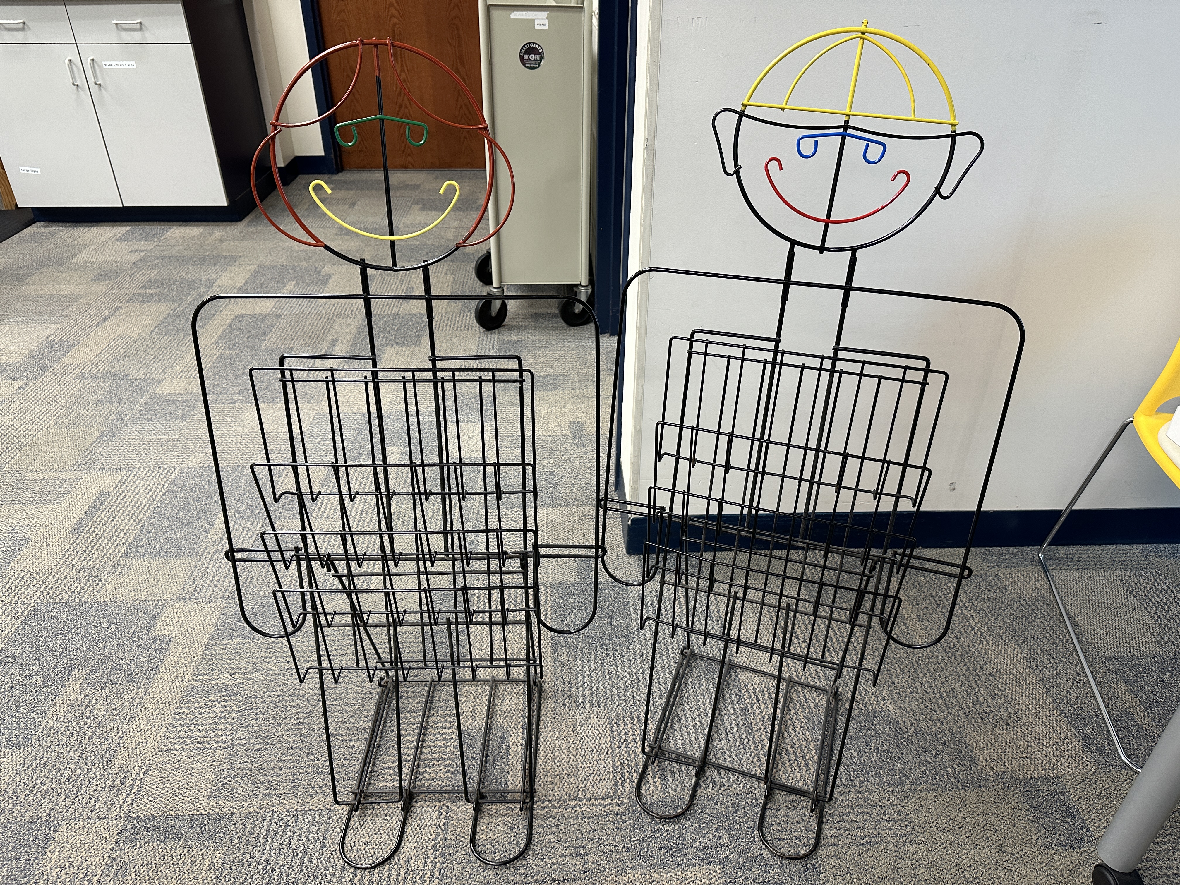 Two kid-shaped wire display racks; each has four shelves/racks. In good condition.