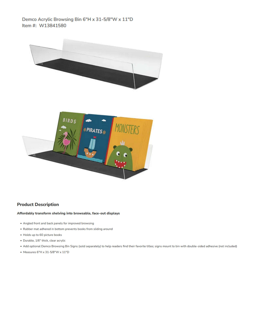 Two Demco acrylic browsing bins are available. Demco item #W13841580; measures 6"H x 31-5/8"W x 11"D. The bins have not been used. One bin has minor damage in one corner - see attached photo.