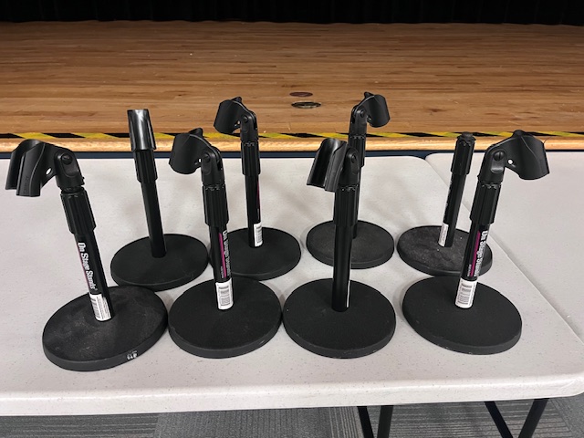 8 desk mic stands, like new. 1 is missing the mic clip.