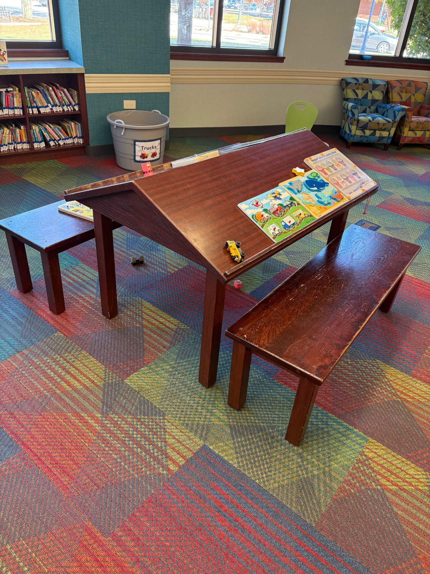 Listing Closed Wooden Puzzle Table with 2 Benches. 48" Long x 35 1/2" Deep X 20" Tall (Low Edge) 33" Tall at top point. Benches are 48" long X 15" Deep X 16" Tall. Pick-up only.