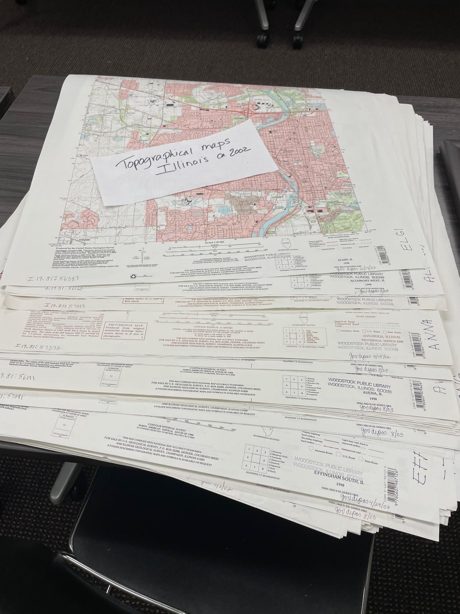 Listing Open Stack of Illinois topographic maps 1998 from the USGS covering much of Illinois - except for Woodstock and neighboring areas.