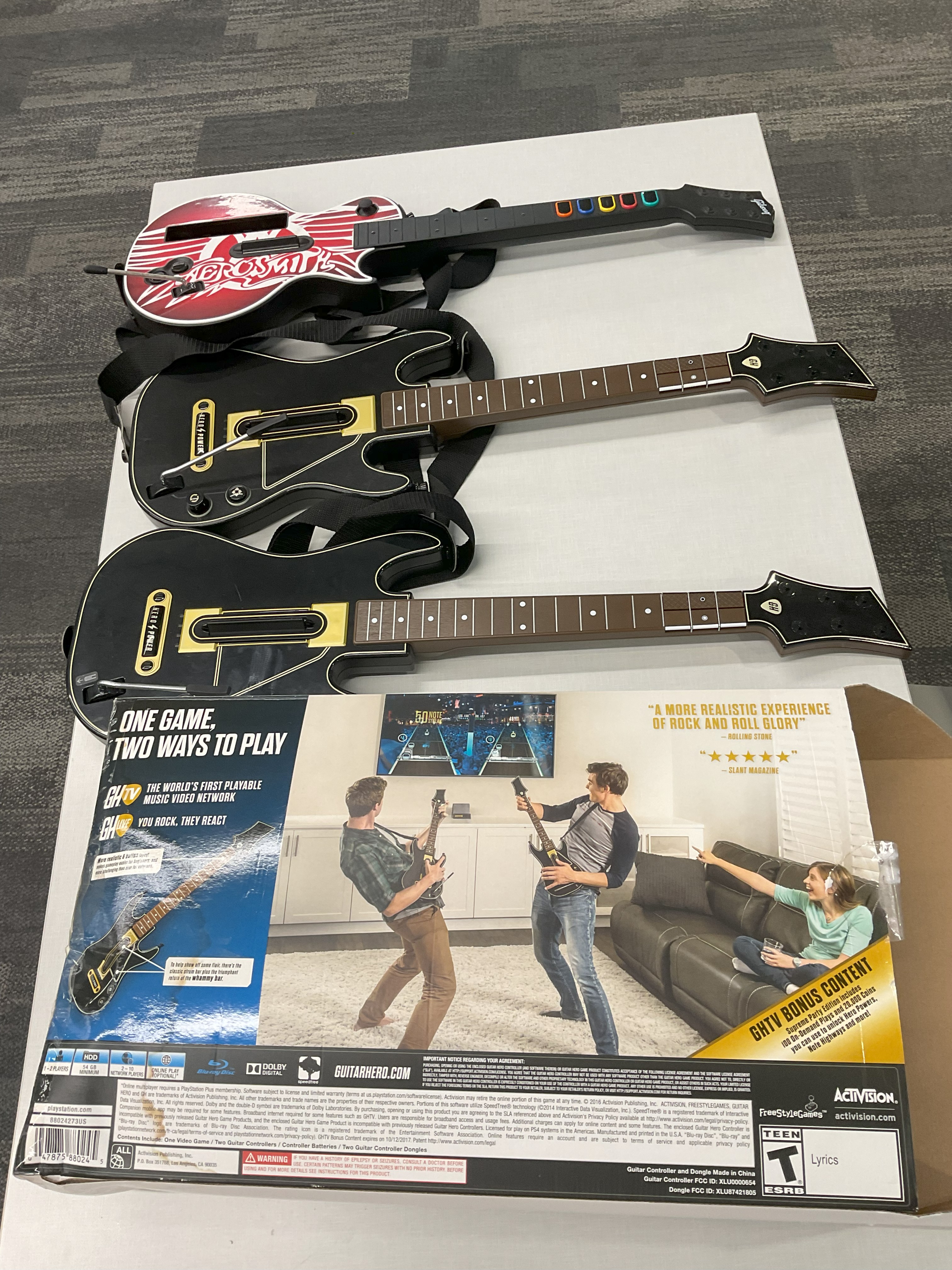 Three videogame guitars available. Two black guitars which box says can be used for Playstation Guitar Hero. The red guitar also says Guitar Hero on the back. All are available for free pickup during Library open hours. Please contact for availability.