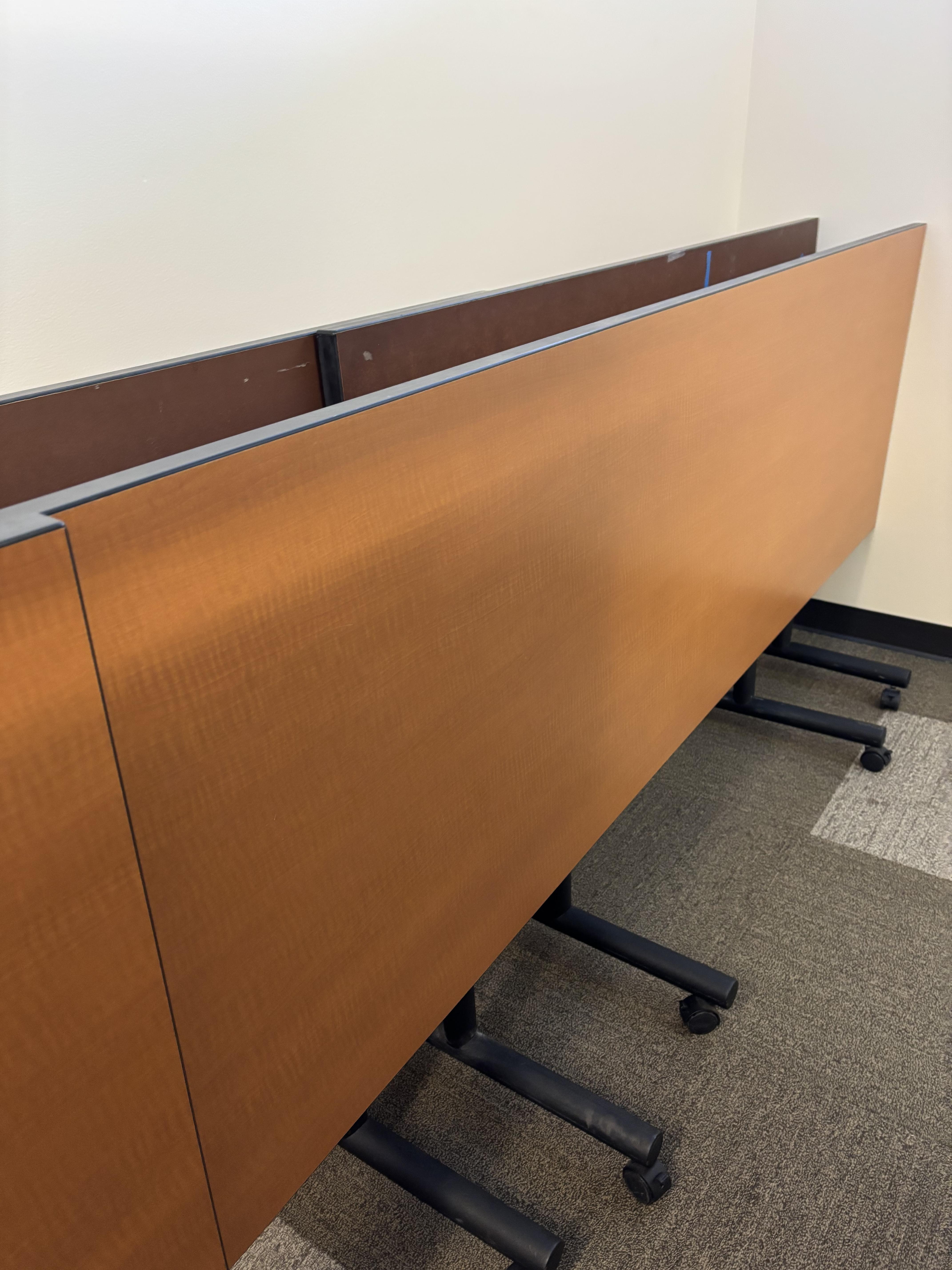 Listing Closed We have 4 tables to give away to anyone who can transport them. Three tables are 8 feet long. One table is 6 feet long. The casters don’t work great anymore. The tops flip up for storage.