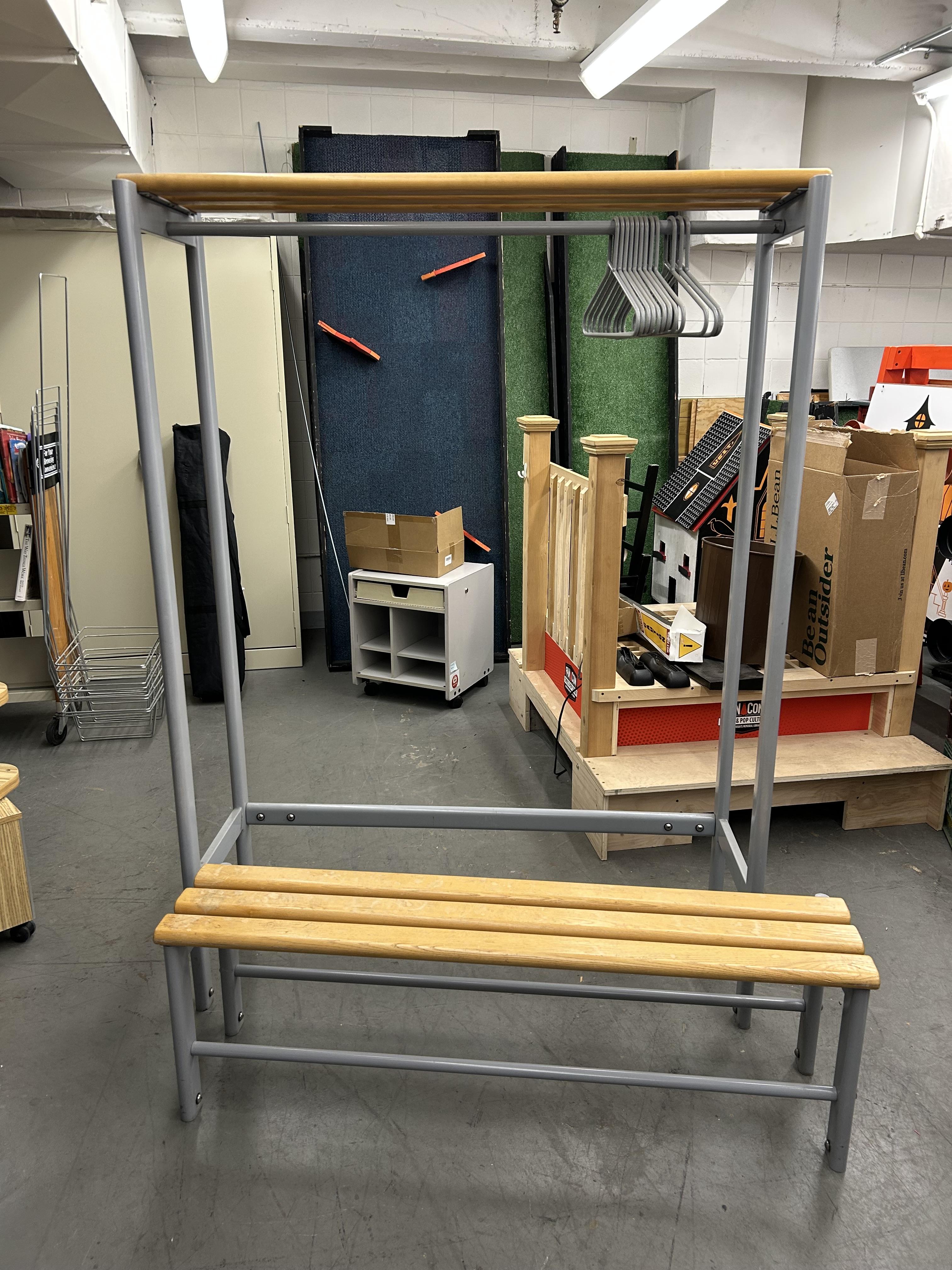 Metal coat rack with hangers and bench, measuring 51.5" W x 17” D x 70.5” H. Please note this item is heavy and will need to be moved and loaded by the recipient, as staff assistance will not be available.