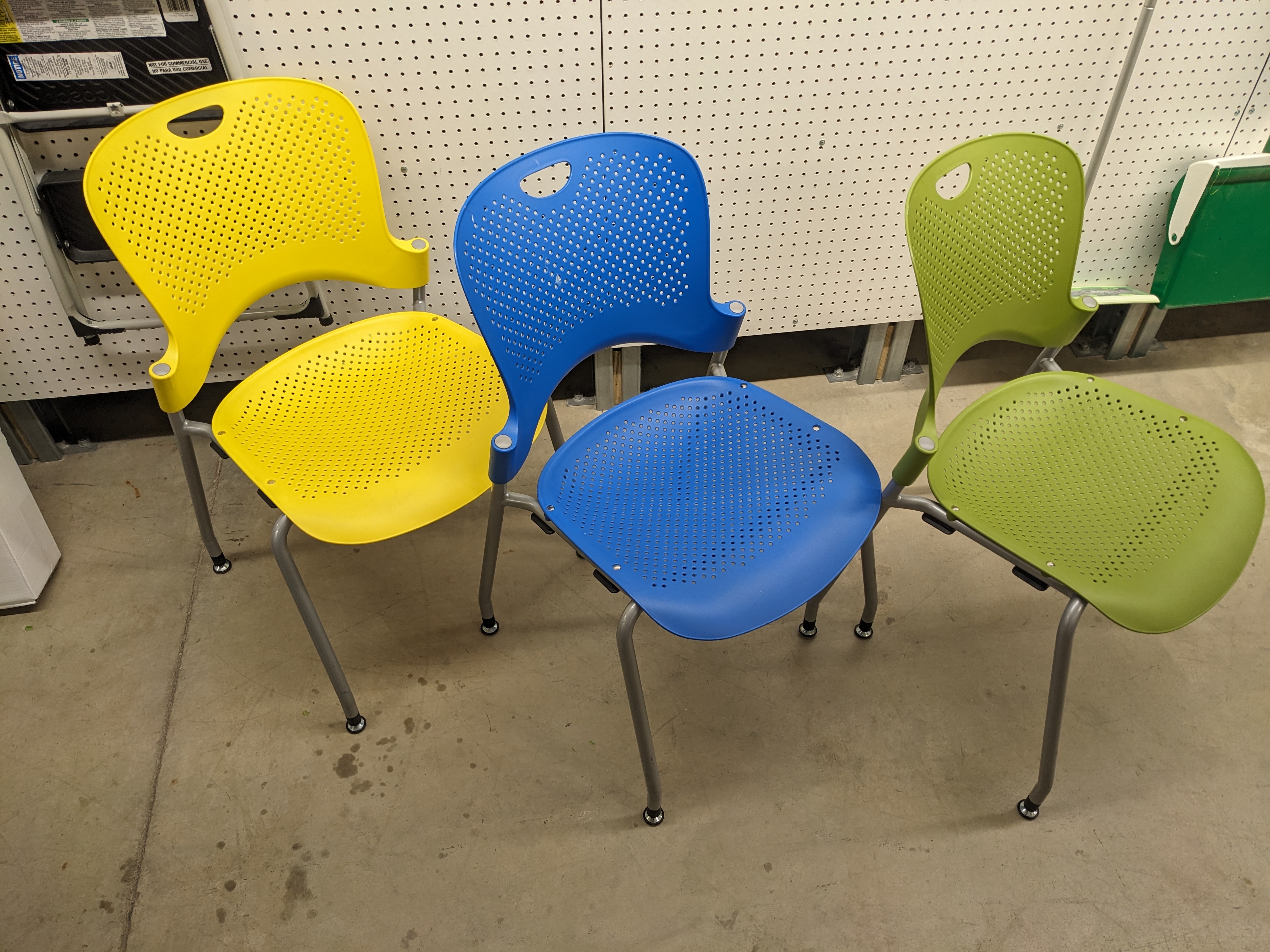 Listing Closed Adult size Herman Miller Caper stacking chairs with plastic slides. Local pickup only. Green: 18 Yellow: 16 Blue: 11 Total: 45