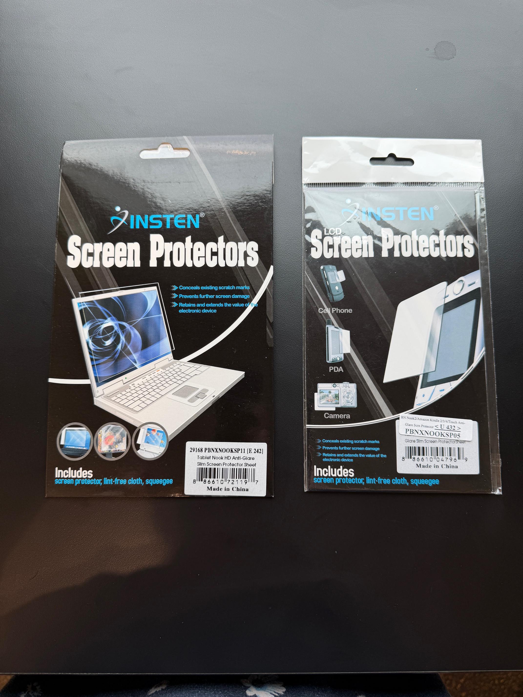 We have approximately 75 screen protectors for Nook and Amazon Kindle 2/3/4. Please note: these do not appear to be compatible with Kindle Fire or Kindle Paperwhite/Colorsoft. Larger protector is approx. 7 x 4 inches (we have about 60 of these) and smaller protector is approx. 4.5 x 3.5 inches (we have about 12 of these).